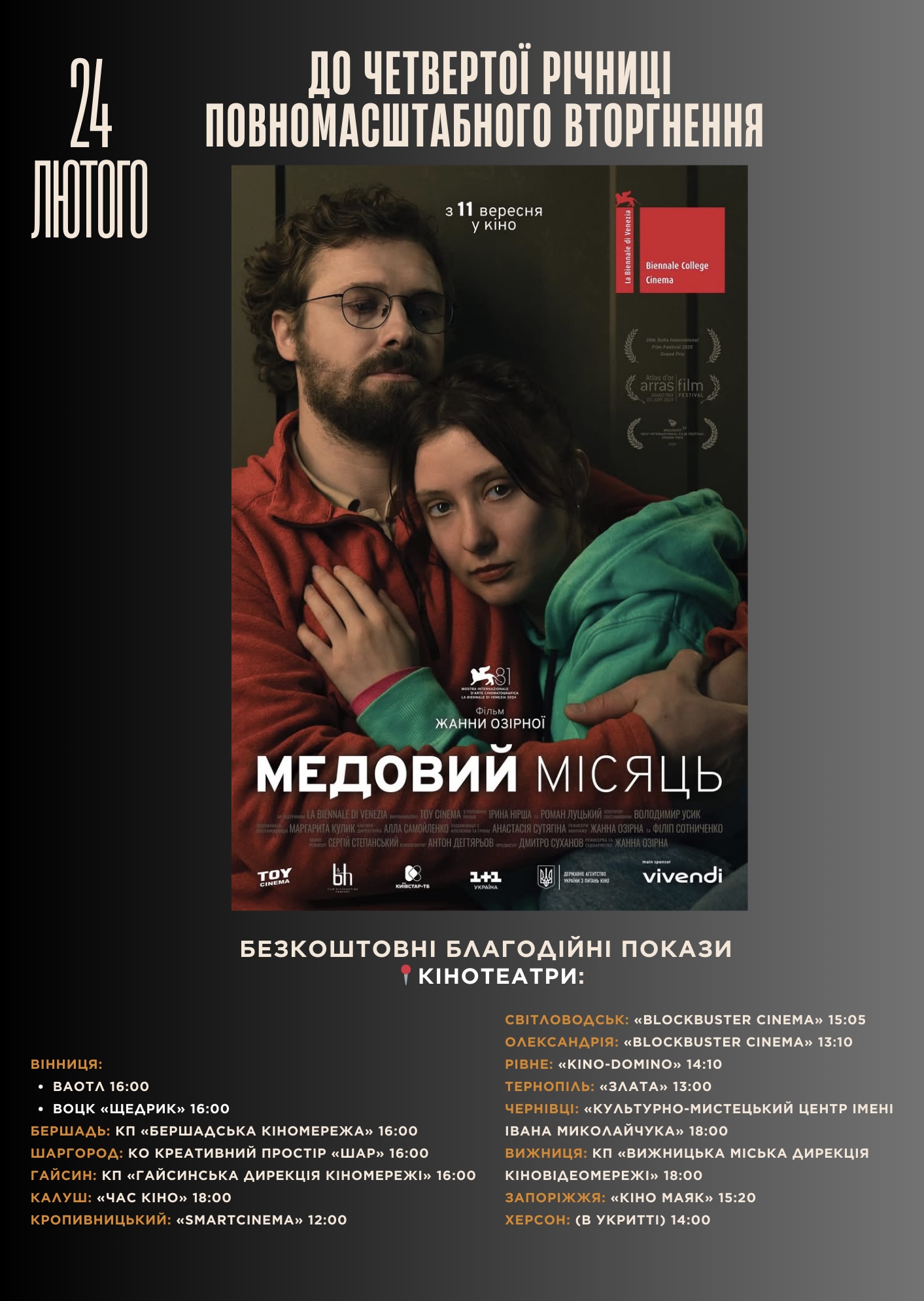 24 лютого, до 4-х роковин повномасштабного вторгнення рф, відбудуться безкоштовні благодійні покази фільму «Медовий місяць».